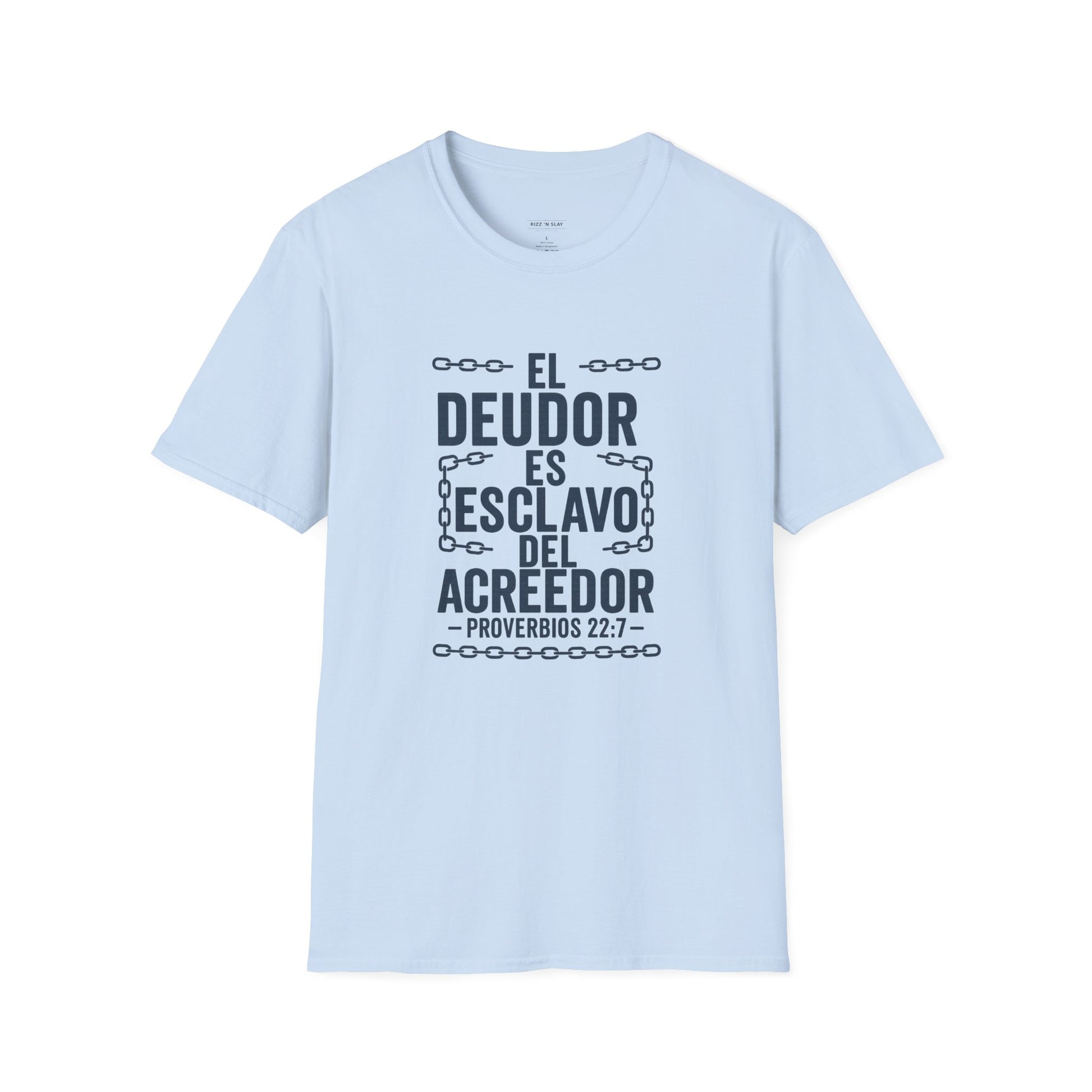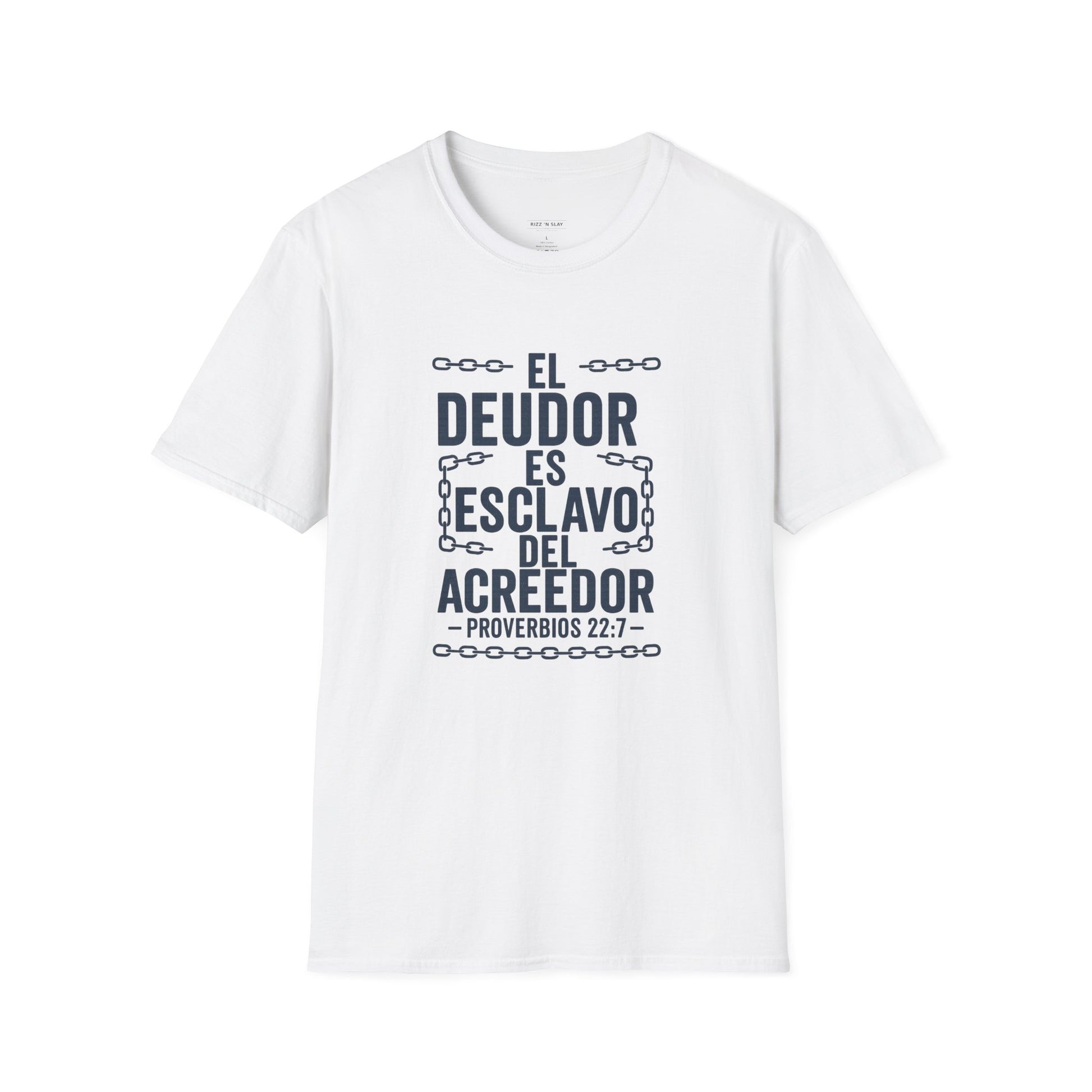 Lleva un poderoso mensaje bíblico contigo con esta camiseta inspirada en Proverbios 22:7: “El deudor es esclavo del acreedor”.