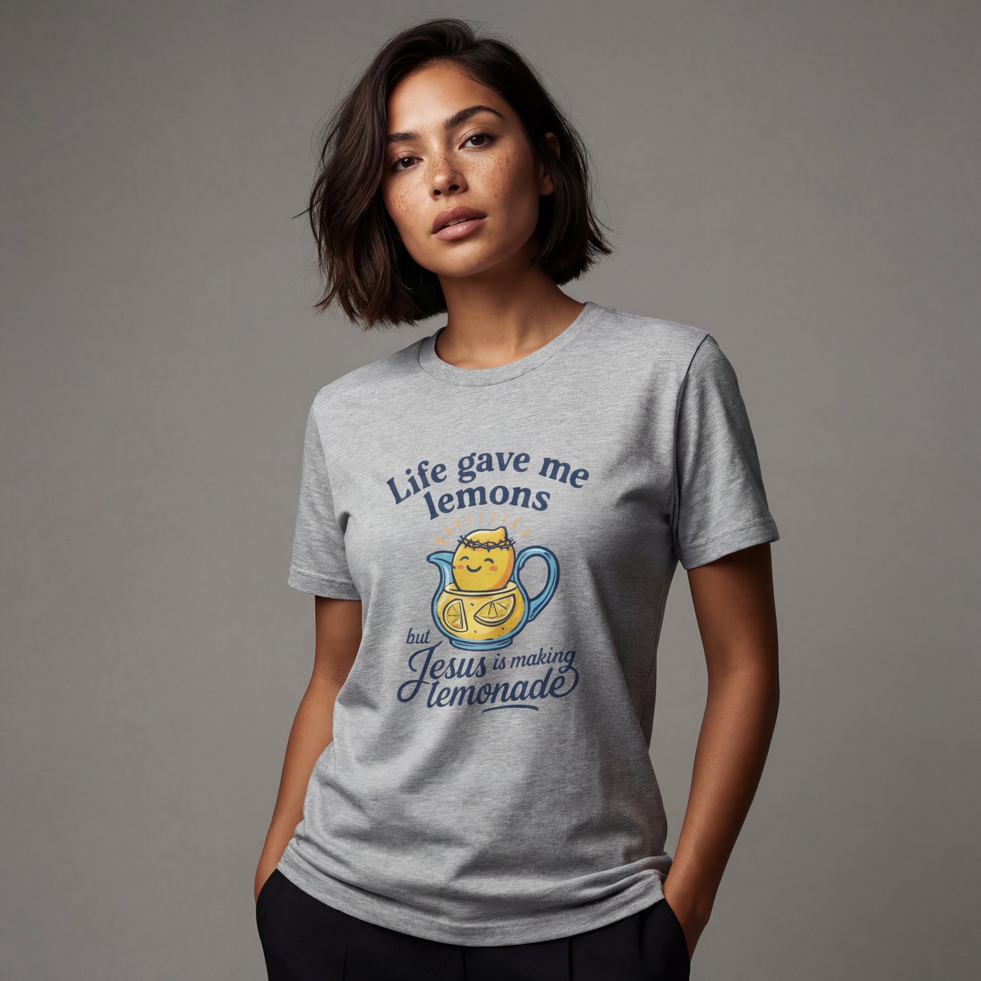 Turn tough days into praise with this “Life gave me lemons but Jesus is making lemonade” Christian T-shirt. Featuring a cheerful lemon in a pitcher and a flowing hand-lettered design, this tee is a fun reminder that God is working even when life feels sour. Soft, lightweight fabric and a classic unisex fit make it perfect for everyday wear—pair it with jeans, joggers, or your favorite cardigan for church, youth group, Bible study, or casual weekends.