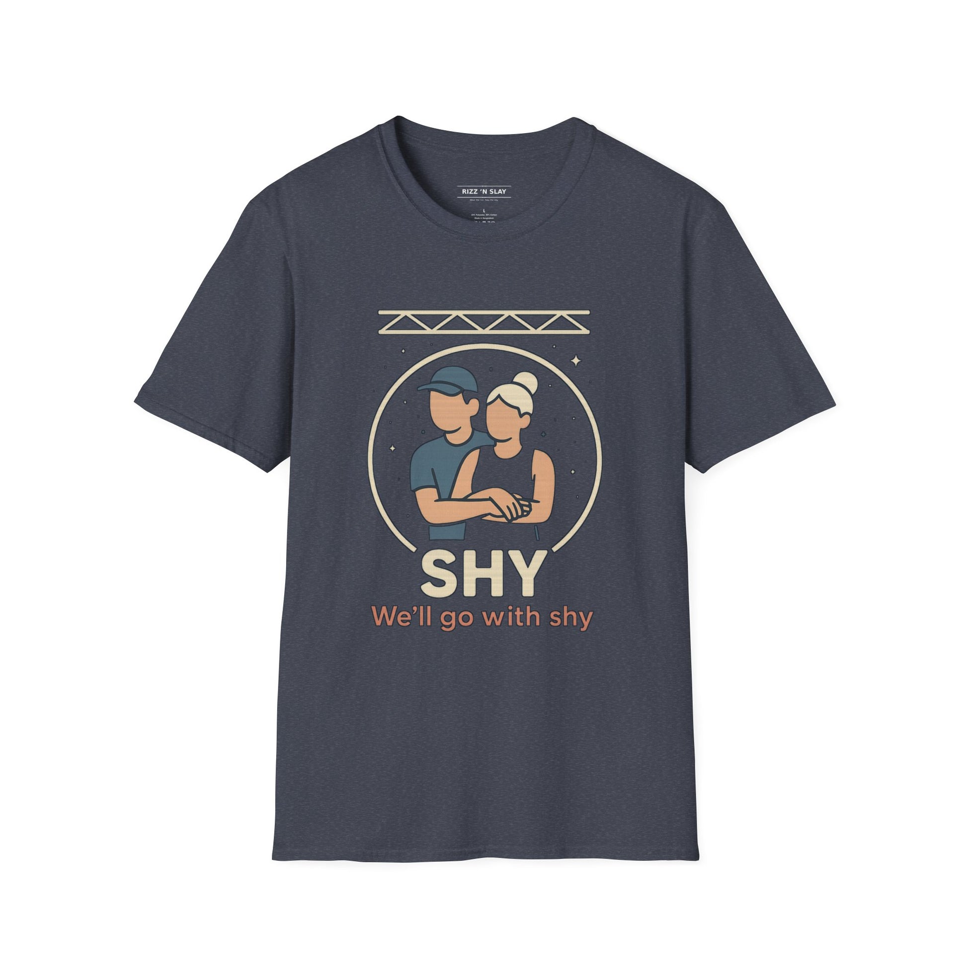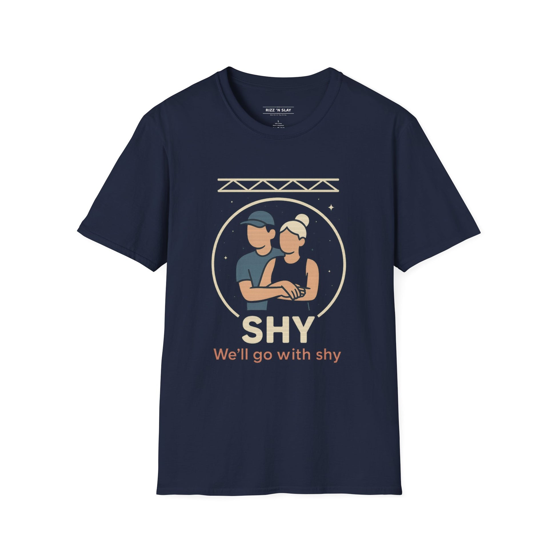 An IYKYK crowd cam shirt in bold, minimalist vector style: two faceless art figures cuddling inside the crowd-cam circle with the insider caption Shy / We’ll go with shy. Printed as a dark garments design with a high-contrast palette, it reads clean from 3–5 feet—perfect as a concert meme t shirt, couple cuddle tee, and inside joke shirt for your next show. A wearable nod to that big screen moment, it also works as a chill festival outfit top or thoughtful date night gift.