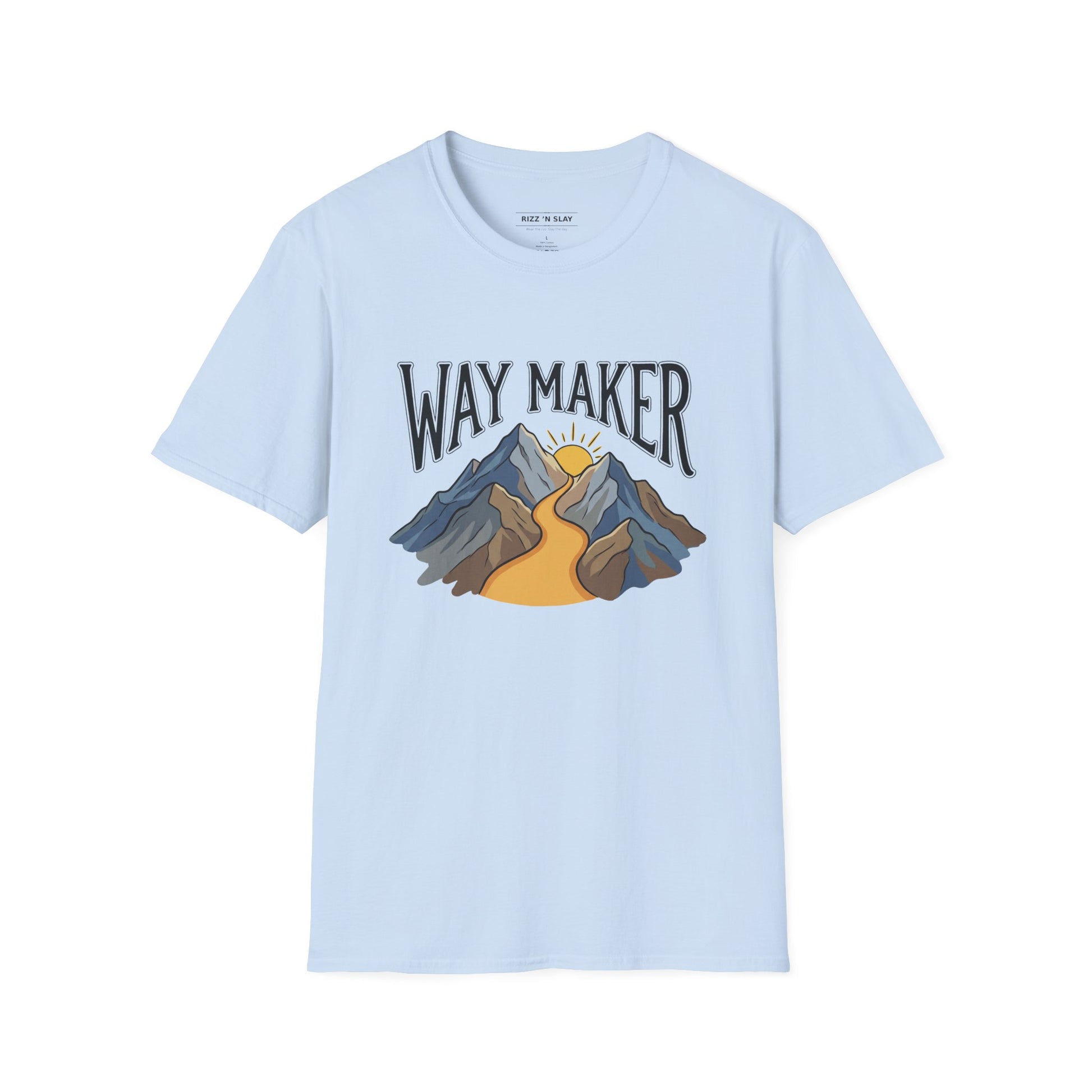 A lightweight, soft cotton tee that carries a quiet, hopeful message. The front artwork shows a winding golden trail through blue-gray mountains toward a rising sun, with the words "WAY MAKER" above — a simple invitation to keep moving forward. Wear it on cool morning hikes, at church gatherings, or while sipping coffee and planning your week. The breathable ring-spun cotton feels gentle against skin and holds printed details crisply, so the design stays vivid through regular wear. Subtle construction details like taped shoulders and a ribbed collar keep the shape polished, while the tear-away label removes any itch. This shirt slips easily into layered outfits — under a flannel, over a long sleeve, or on its own — and becomes a quiet, wearable reminder of purpose and direction.